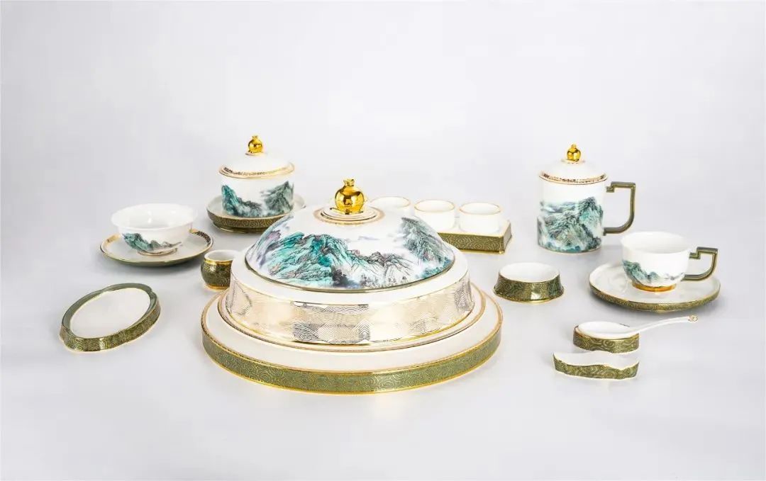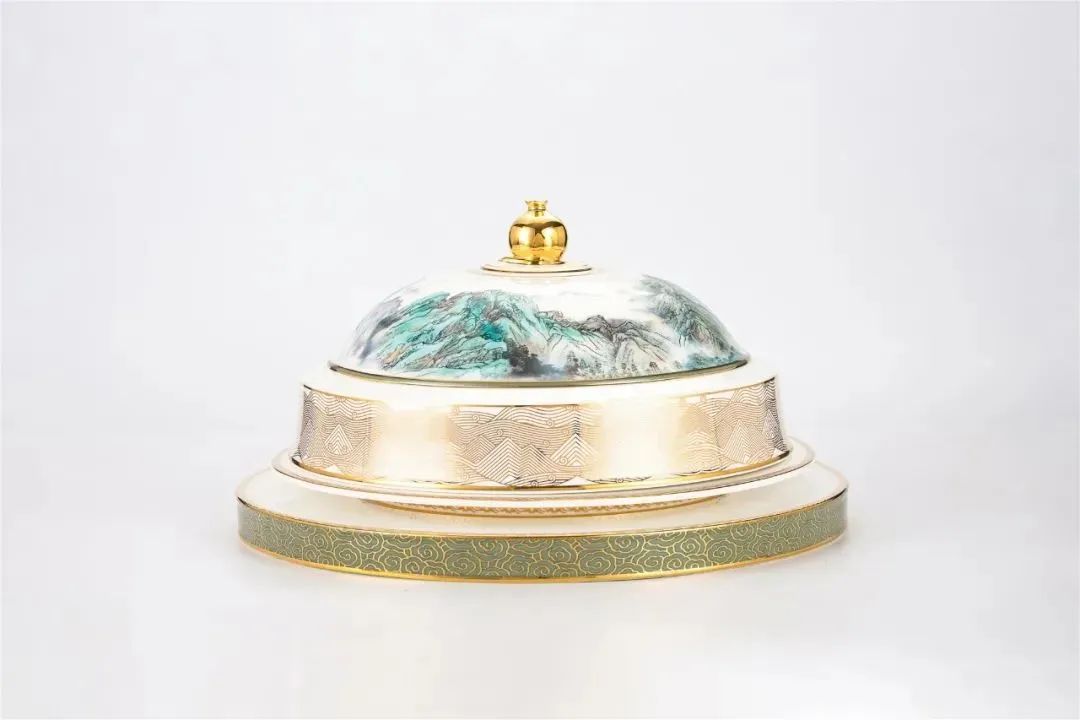 山水秦韻系列冷菜蓋由莊志誠等設計師開(kāi)發(fā),設計語(yǔ)言以 “圓”展開(kāi),寓意圓融圓滿(mǎn)、萬(wàn)眾同心、逐夢(mèng)圓夢(mèng)?;娌捎?ldquo;中華龍脈-秦嶺”為主裝飾,以青綠山水形式表達;蓋頂的設計融入 “石榴”元素,表達出“同心同行”的主題。